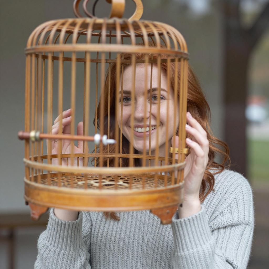 Photograph of a young woman with fair skin and red hair, smiling, wearing a gray knitted sweater. Her reflection in a glass window shows an old wooden birdcage overlaying her face. Background includes trees and a blurred outdoor setting. Her expression is cheerful. The glass adds a ured overlay to the image.