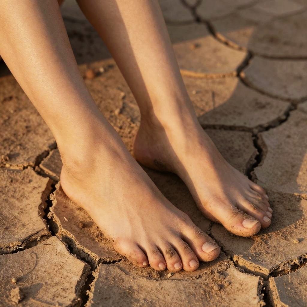 Artistic composition of dirty female feet resting on cracked desert soil, dry cracked earth patterns contrasting with natural human skin tones, warm golden hour lighting, emphasizing textures and natural beauty in imperfection, hyperrealistic.