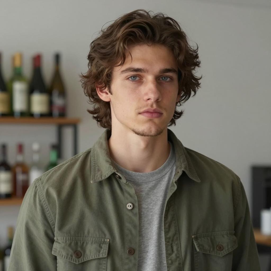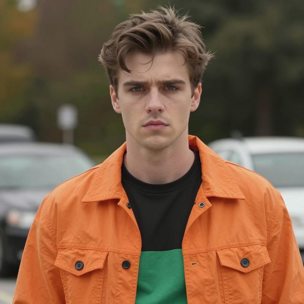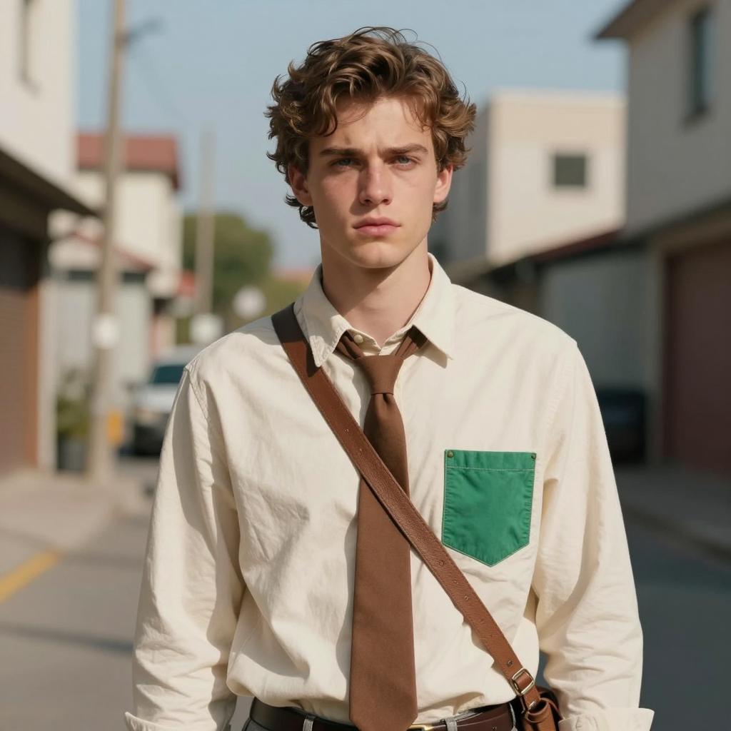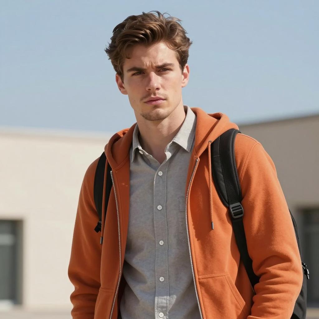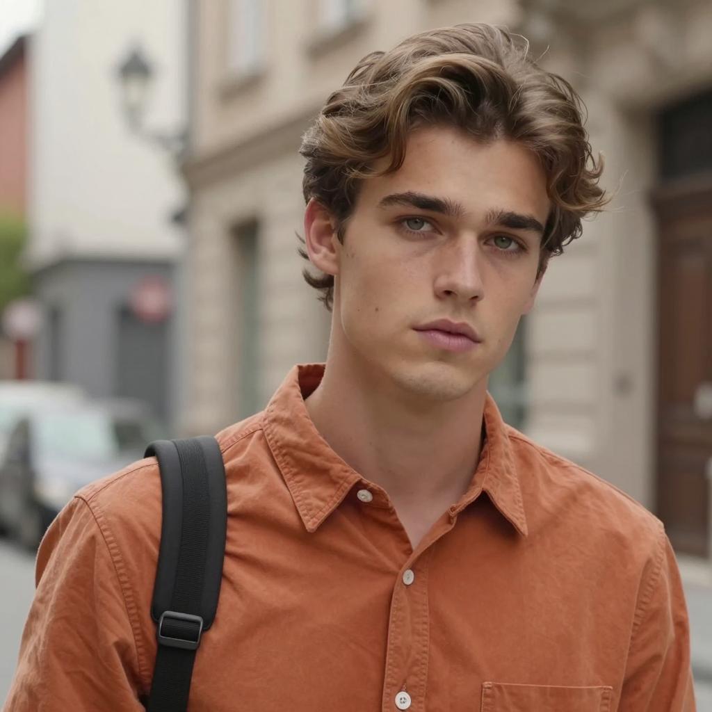 Casual chic dress code male, photorealistic portrait of a handsome young man with green eyes, light brown wavy hair, wearing a button-up orange shirt, black strap over shoulder, serious expression, urban background with blurred buildings and street lamps, daytime, realistic lighting, close-up, slightly tilted head, casual style, natural light