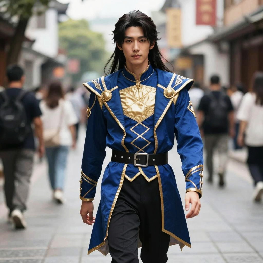 Photograph of an Asian male with long black hair, wearing a blue and gold military-style outfit, standing in a bustling, blurred urban street with pedestrians