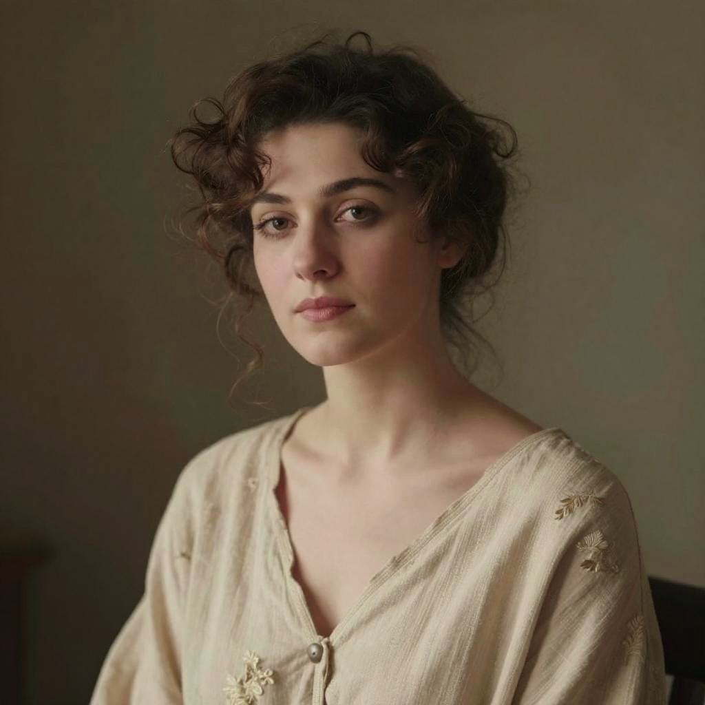 Photograph of a young woman with fair skin and dark, curly hair that is slightly tousled. She has a calm, introspective expression and is looking directly at the camera. She is wearing a loose, beige, V-neck blouse with subtle floral embroidery and a button down the center. The background is softly blurred, with muted, earthy tones that highlight her face and upper body. The lighting is gentle, casting soft shadows that emphasize her delicate features and the texture of her blouse. The overall mood of the photograph is serene and intimate.