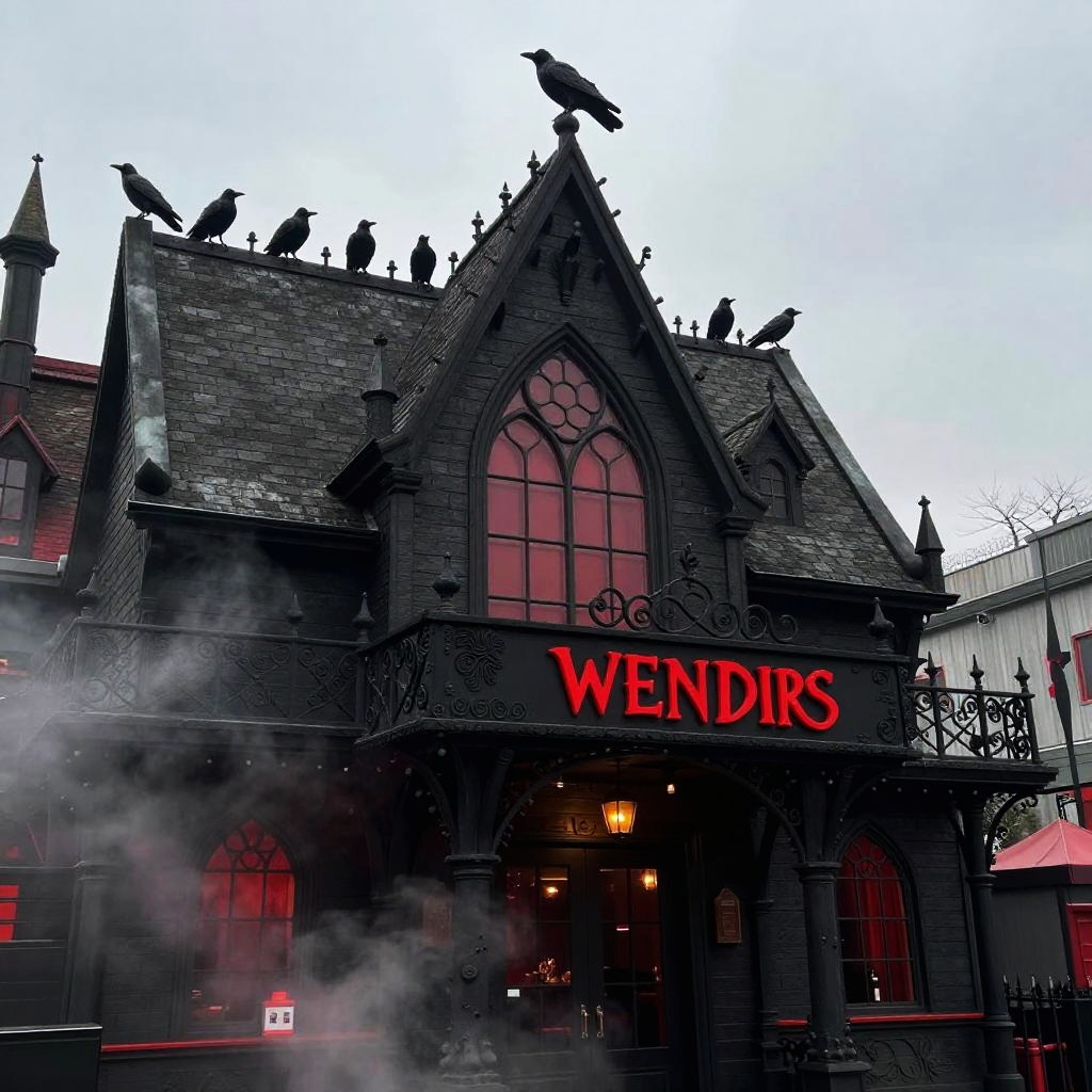 Goth Wendy's themed restaurant, black and red color scheme, crows perched on the roof, smoky fog surrounding the building, gothic architecture with sharp angles and twisted ironwork, mysterious vibe