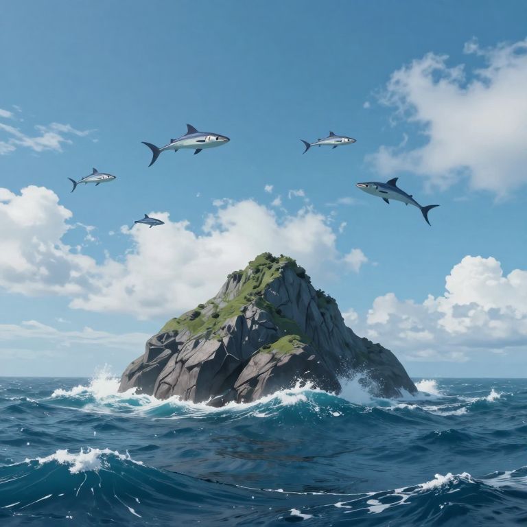 An inverted mountain pierces the azure sky, cradled by restless waves, as ethereal skyfish glide through the heavens, painting the clouds with whispers of freedom and dreams seasoned with the salt of the sea.