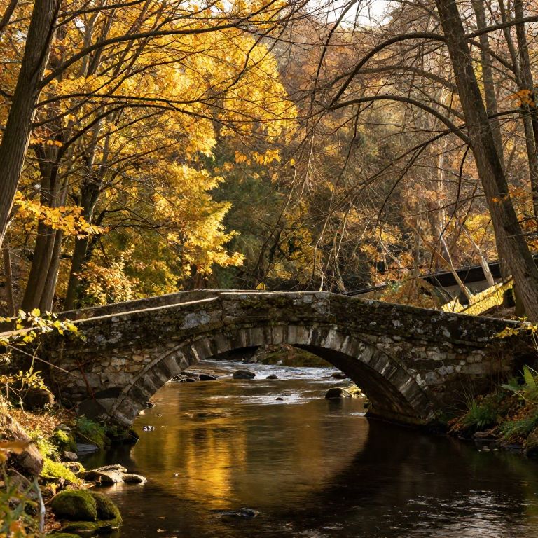 Cerradas ancient stone bridge over a tranquil river in a hidden forest, surrounded by autumnal trees with golden leaves, warm sunlight filtering through branches, photorealistic environment