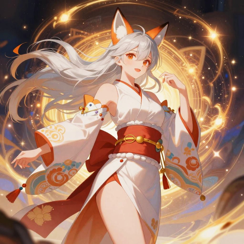 Mystical fox woman anime character with fiery orange hair and multiple fox tails, casting a spell, surrounded by floating fire orbs, detailed fantasy environment, dramatic lighting