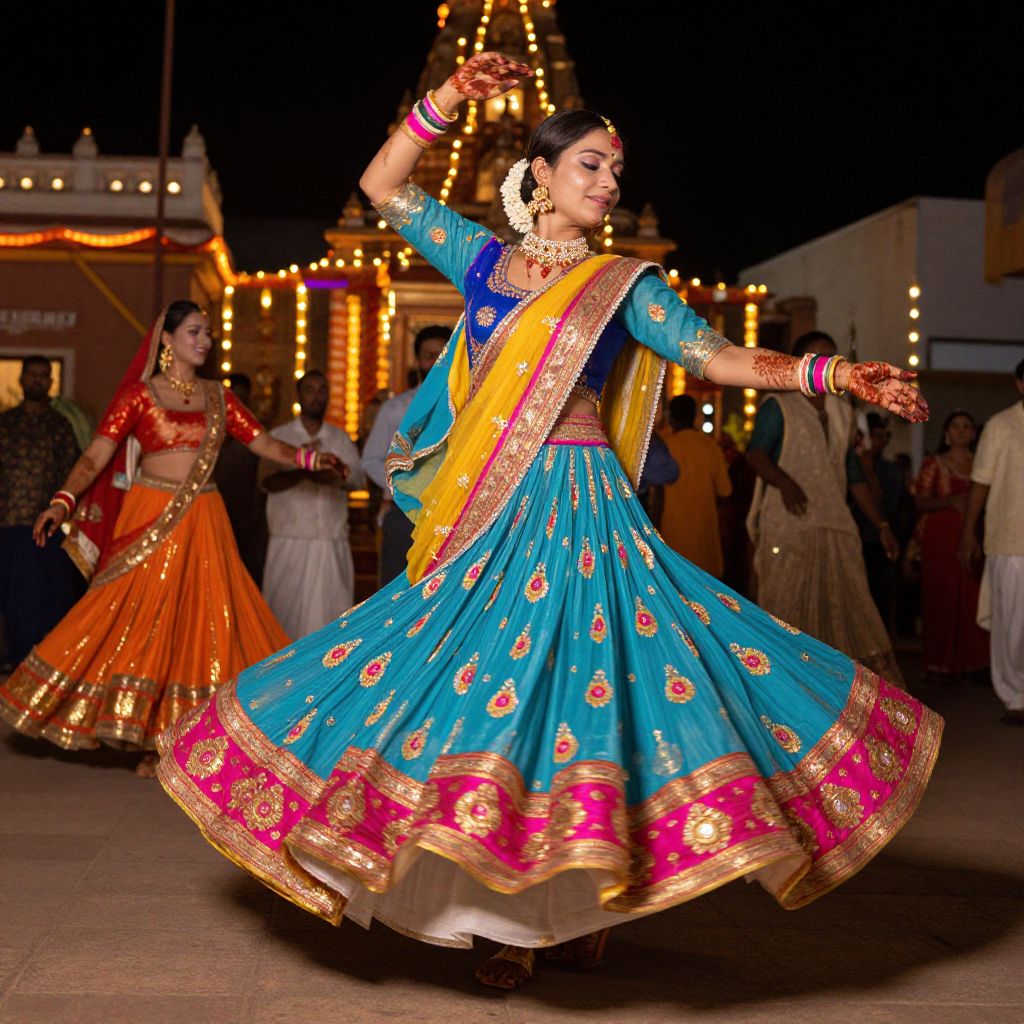 Women wearing flowing saris dancing gracefully during a traditional Indian festival, bright colors swirling in motion, elaborate henna designs on hands, culturally rich atmosphere with lantern lights and temple backdrop, dynamic and joyful expression, detailed fabric movement