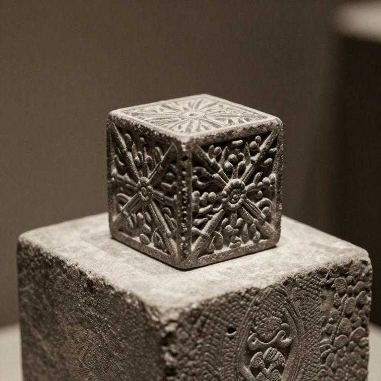 Stamping a small cube made of intricately carved stone, it rests on an ancient display pedestal, sepia tone, Rob Gonsalves,