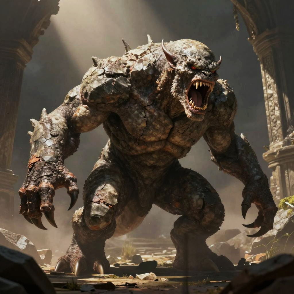 Bald monster with cracked stone-like skin, massive claws, roaring fiercely in an ancient ruin, dramatic shadows, atmospheric and detailed, fantasy creature design