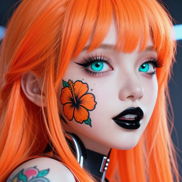Extreme close-up Portrait of a beautiful, stunning unique cyborg girl, She has large turquoise eyes filled with joy and excitement, extravagant eyelashes, She has neon orange hair cascading down her shoulders, contrasting sharply with her black lipstick, making this image a masterpiece art style is highly detailed, in the vein of futurist anime, capturing the beauty of the cyborg girl, 32k UHD, expressive eyes, cyberpunk, graphic design, orange hibiscus tattoo, girl's face, side view, pretty and cute, gleaming lips, white skin, telling a tale of adventure, Exuding confidence and serenity, Vibrant tattoos adorn her sun-kissed skin