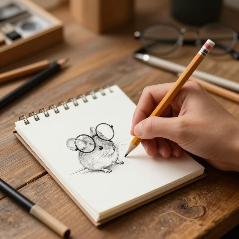 Photograph of a right hand holding a sharpened yellow pencil, sketching a small, whimsical mouse with a curled tail on a white spiral-bound sketchpad. The sketchpad rests on a rustic wooden table. Surrounding the sketchpad are various art supplies: a black marker, a silver pencil, and a pair of black-rimmed glasses in the blurry background. The hand has a light skin tone, and the pencil has a pink eraser tip. The image has a warm, natural light, highlighting the textures of the wood and paper. The overall style is casual and artistic.