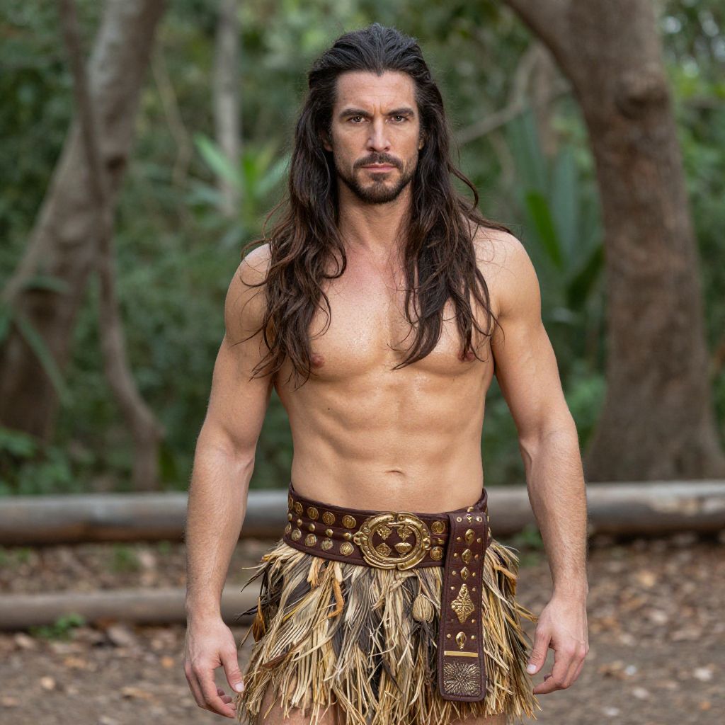 Photograph of a muscular man with long black hair, bearded, shirtless, wearing a fringed, leather-belted loincloth in