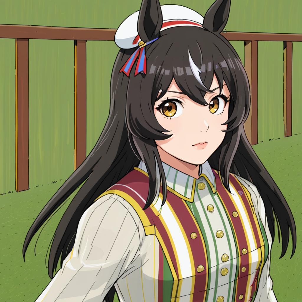 Anime-style illustration of a female horse girl character with long black hair, blunt bangs, and large horse ears. She has golden yellow eyes and is dressed in a colorful outfit featuring a white blouse with puffed sleeves, a yellow and red collar, and blue and pink striped details. The character also has a small ahoge and ear covers.