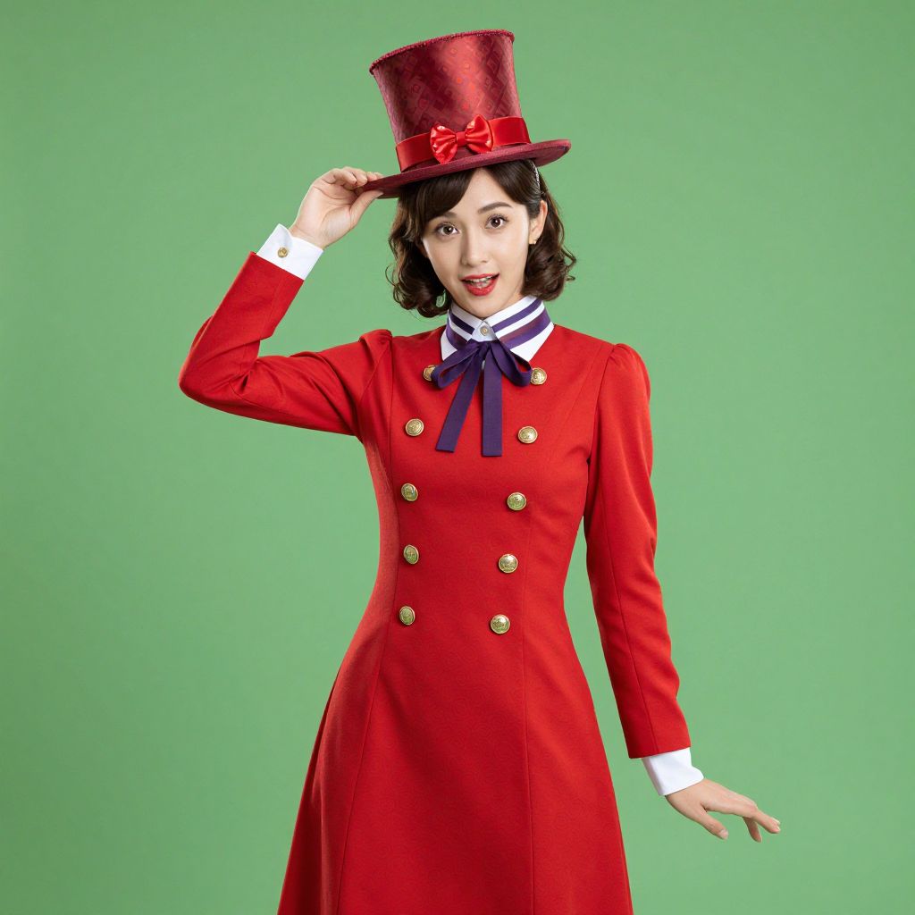 Photograph of a fair-skinned woman with short, curly black hair, wearing a bright red, long-sleeved, double-breasted coat with gold buttons and a white collar accented with a navy blue ribbon. She dons a tall, red, glittery top hat adorned with a red bow. She stands against a solid green background, holding her hat with her right hand and smiling with red lipstick. Her left hand is relaxed by her side. The image has a vibrant, festive, and whimsical style.
