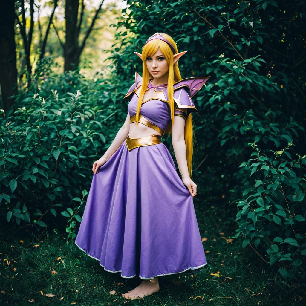 Cosplay costume idea, Link CDi, bright golden hair, purple headpiece, form-flattering lilac dress with midriff cutout, elf ears, elegant cosplay, vignetting, full body shot