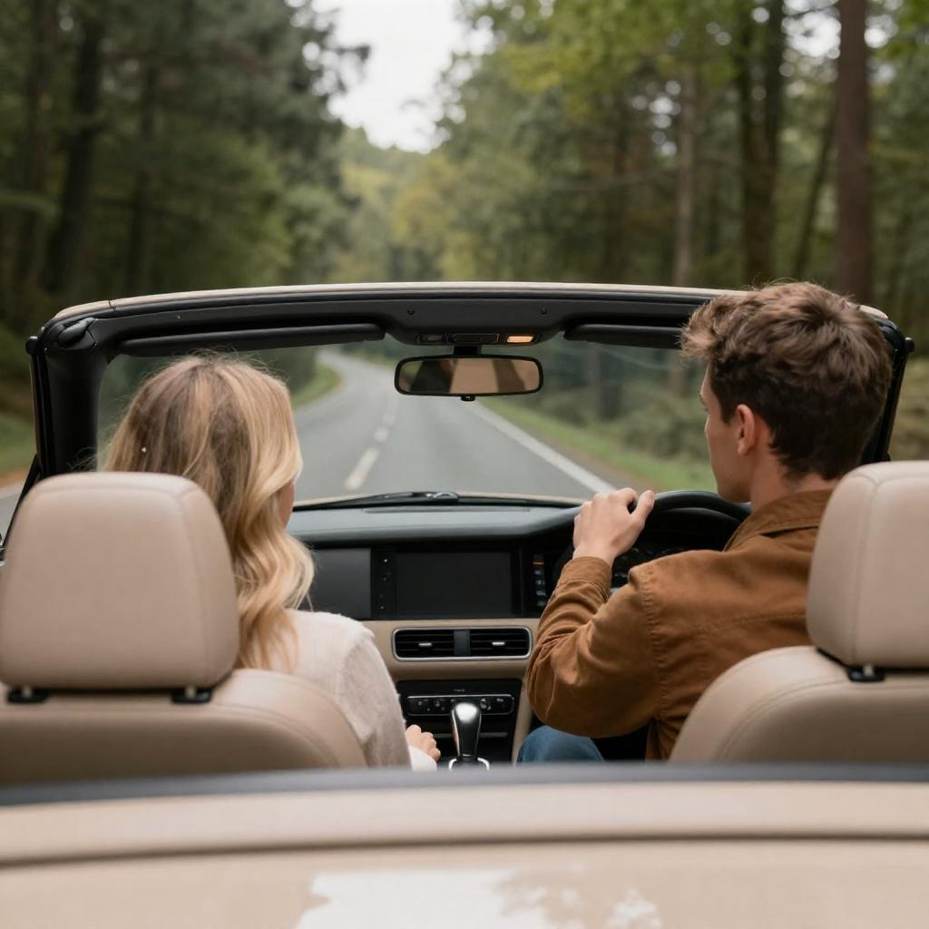 Photograph of two people in a tan convertible driving through a forested area. Man with short brown hair, brown jacket, driving, looking ahead. Woman with long blonde hair, beige leather seat, facing forward. Road ahead visible, trees on both sides. Man's right hand on steering wheel, woman's left hand on lap. Sunlight filtering through trees.