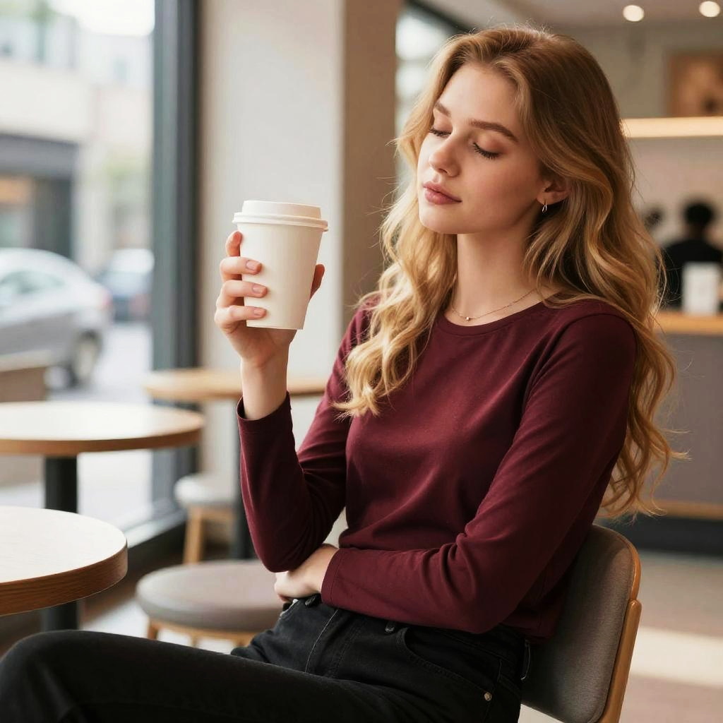 Photograph of a young woman with long, wavy blonde hair, wearing a maroon long-sleeve top and black pants. She's sitting in a modern, brightly lit café, holding a white paper coffee cup in her right hand while her left arm crosses her chest. Her eyes are closed, and she has a calm, introspective expression. The background is blurred, showing large windows and tables.