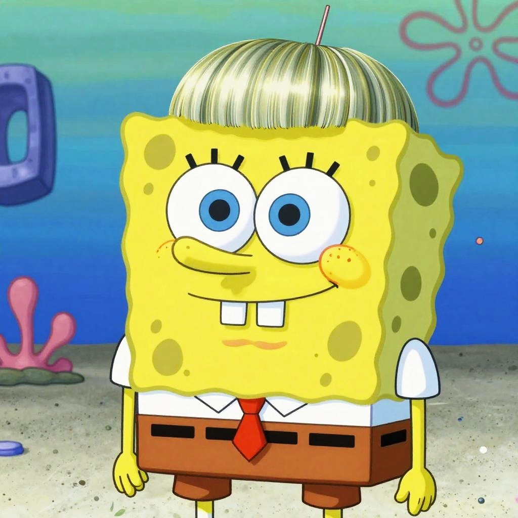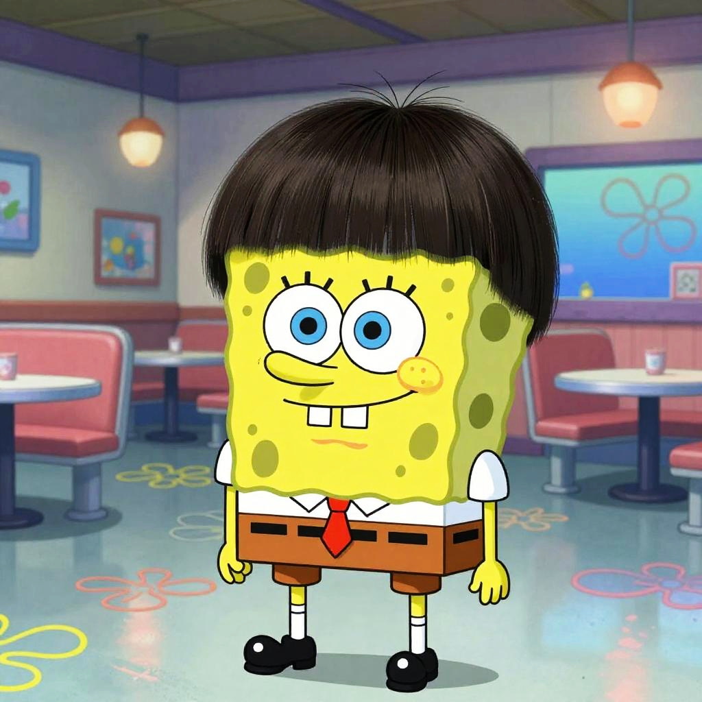Spongebob bowl cut, whimsical underwater scene featuring spongebob with a smooth bowl cut hairstyle, playful bubbles and jellyfish floating around, vivid blue ocean hues, stylized animation style