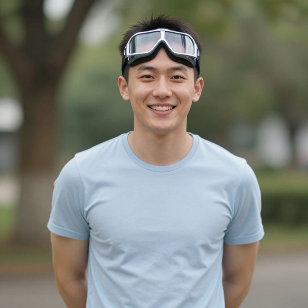 "funny party costume, 1boy, male focus, blurry background, outdoors, smile, blurry, goggles, looking at viewer, solo, day, arms behind back, short sleeves, tree, goggles on head Realistic photo of casual sexy person with pretty face"