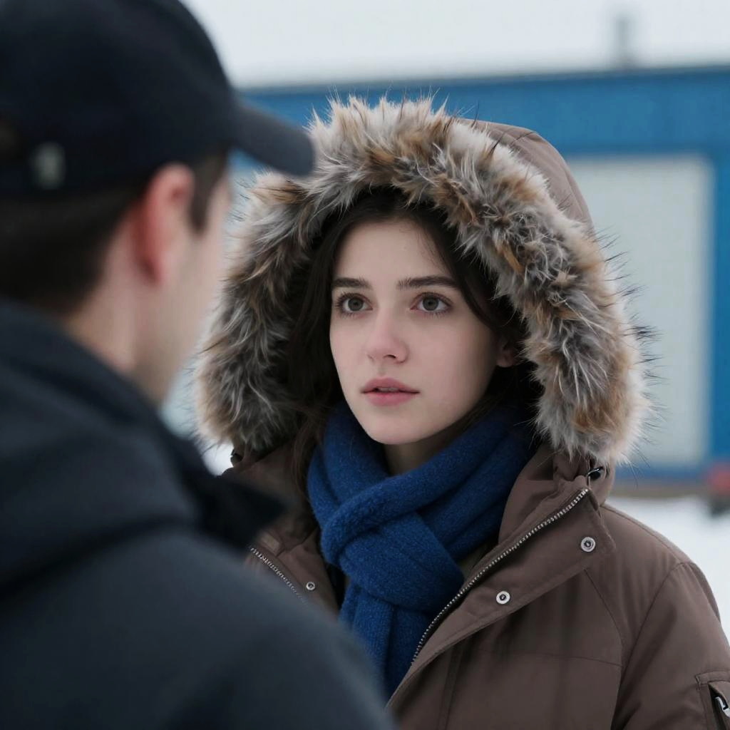 Photograph of a young woman with pale skin and dark hair, wearing a black hooded coat, standing in a muddy village. She holds a black notebook and gazes forward with a neutral expression. Background includes makeshift wooden huts, a pink chair, a child in blue, and a man in a green jacket. Several people in the background. Leafless trees and bicycles are visible.