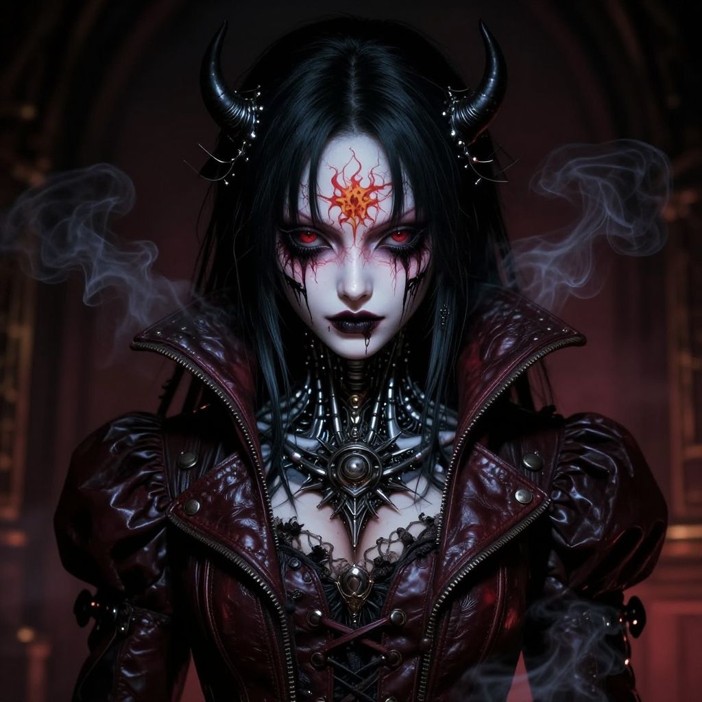 Digital artwork of a dark, gothic female figure with pale skin, black hair, and red eyes. She has black horns, a red star tattoo on her forehead, and blood-like streaks under her eyes. She wears a black, leather, spiked, and armored jacket with intricate designs and a high collar, exposing a detailed chest piece. Smoke swirls around her, adding a mystical aura. The background is dark and blurred, highlighting her menacing, supernatural presence. The overall style is dark fantasy, with a gothic and occult influence.