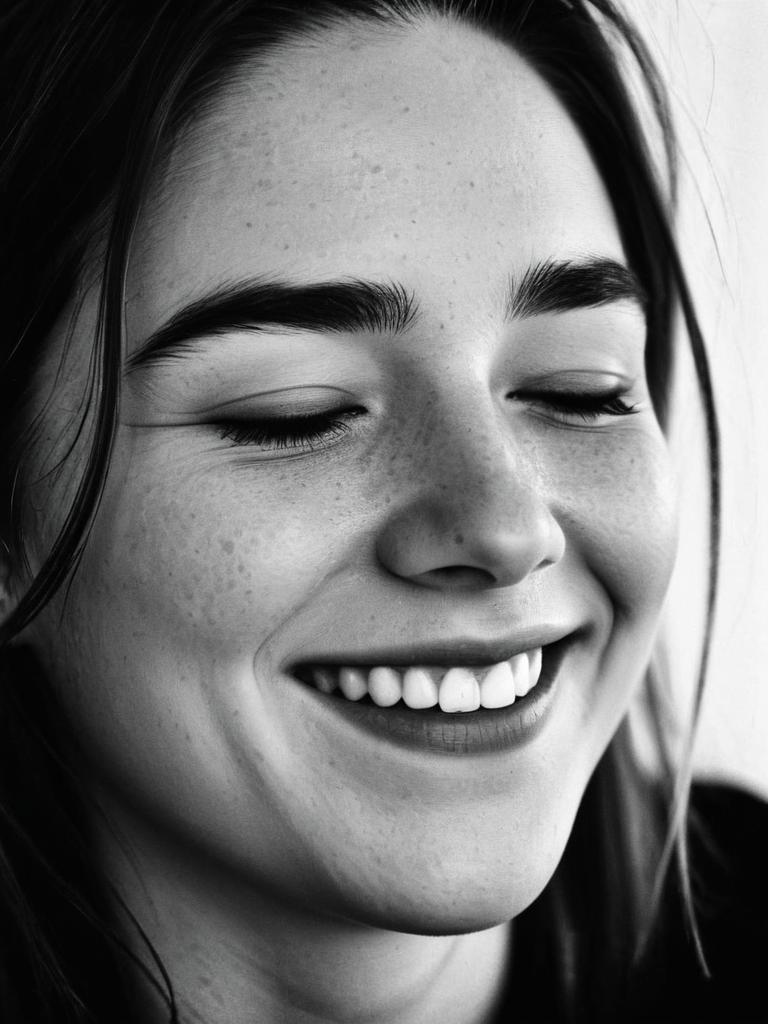 A close-up black and white portrait of a young woman with freckles, smiling broadly with eyes closed, natural candid expression, high contrast lighting emphasizing skin texture and fine details, soft focused background
