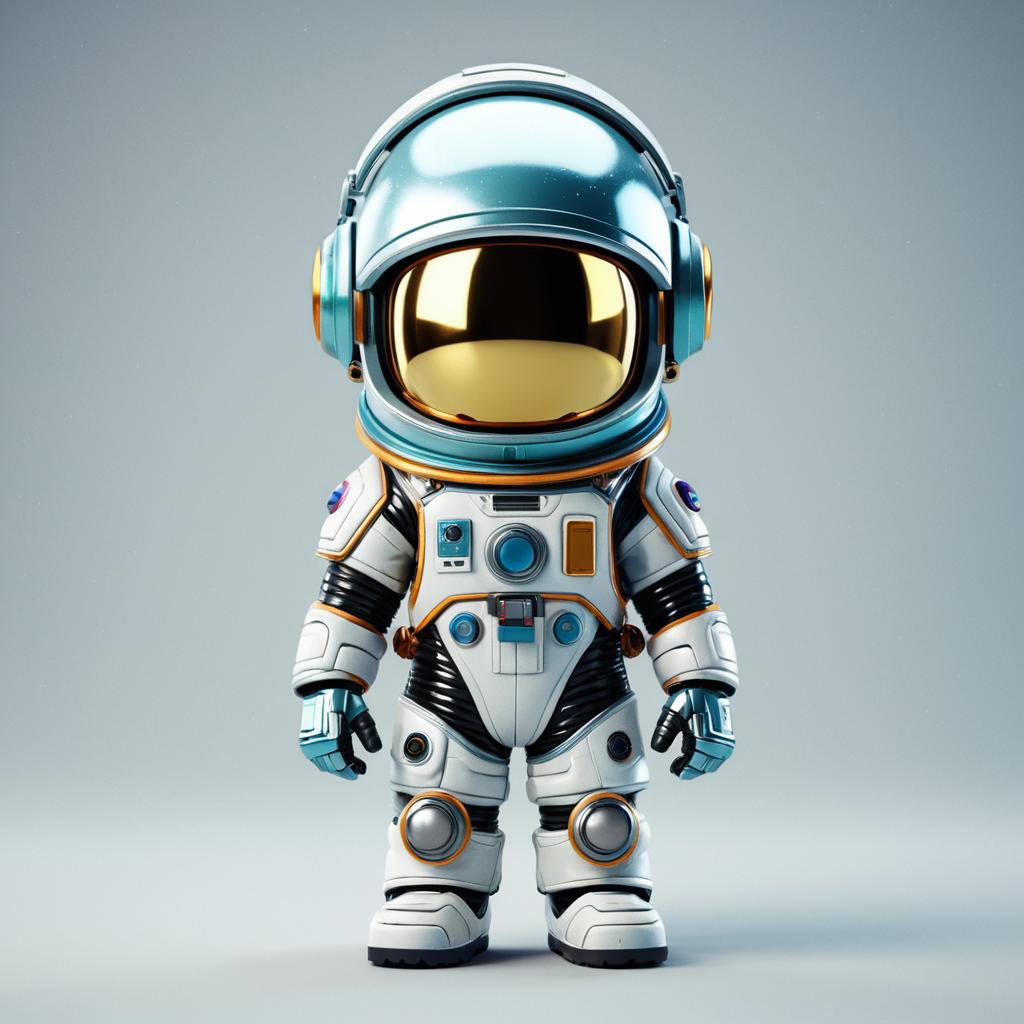 3D rendered image of a tiny astronaut character wearing a bulky, shiny space suit with cool metallic colors. The suit features a large helmet with a reflective gold visor, detailed with blue and orange accents. The character is standing against a plain light grey background, designed in a Pixar and Skottie Young-inspired surreal modular constructivism style.