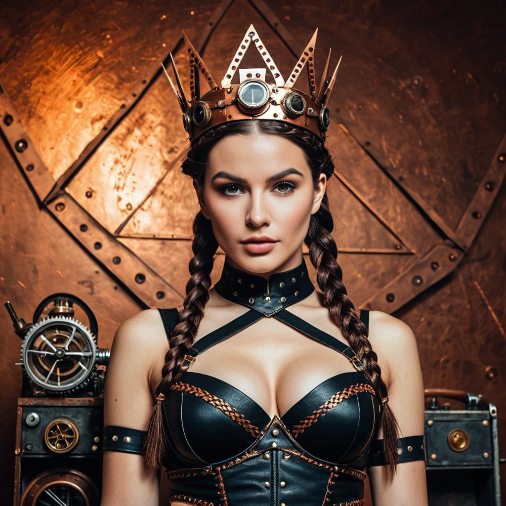 Photo of a Broad Shoulders woman, Braided Crown, slutty outfit, high waist black leather mini skirt with sheer red lace bralette and stiletto heels, vibrant and quirky feeling