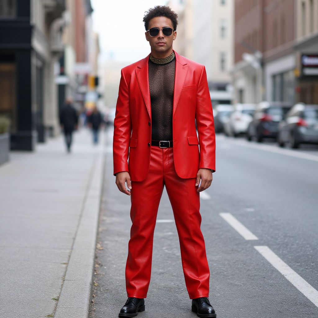 Stylish Party Wear Top Costume, man in a red leather suit standing on a city street