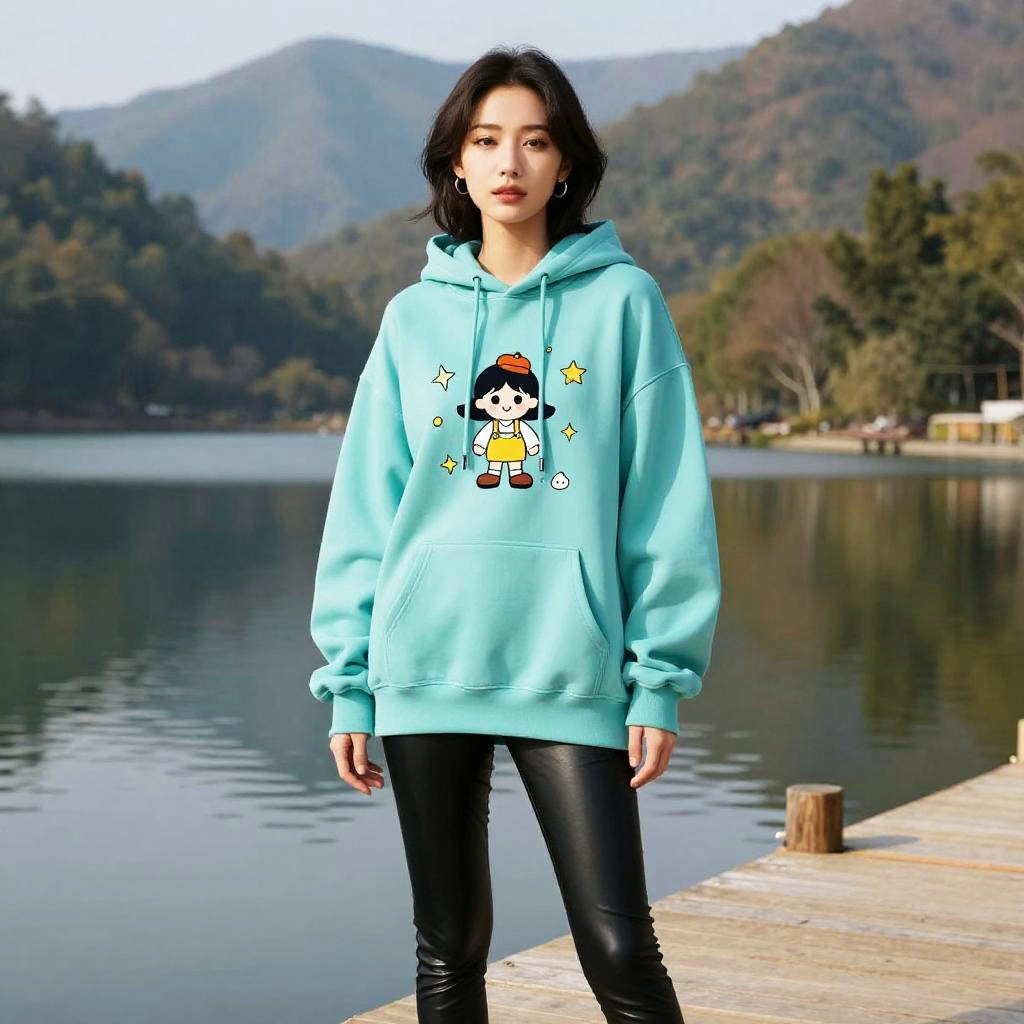 A woman in casual streetwear, wearing an oversized turquoise hoodie with cartoon graphics and black faux leather skinny pants, standing at a mountain lake with a wooden dock, in the style of toei animation. Sexy. Pretty face and beutiful eyes