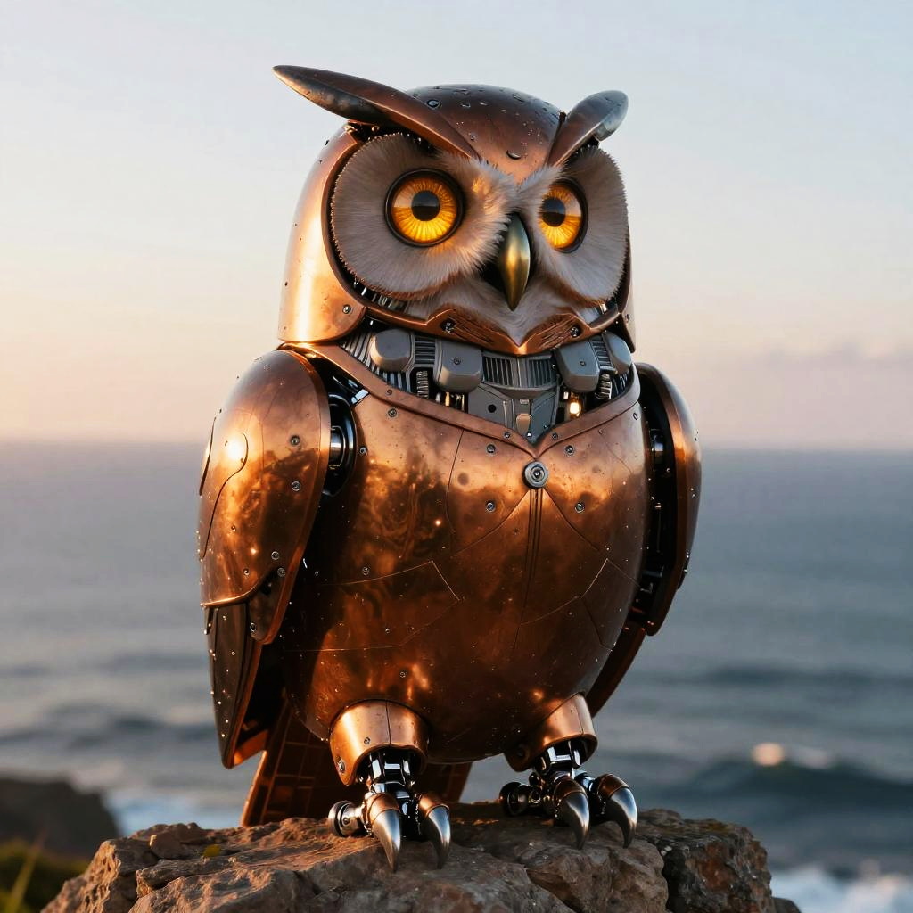 A warm brass rim lighting with soft volumetric haze illustration showcasing a three-quarter view of a mechanical owl, designed as a steampunk automaton. Enhanced with warm brass rim lighting with soft volumetric haze, this piece reflects a blend of modern and classic artistry, rich in detail and rendered in high definition.