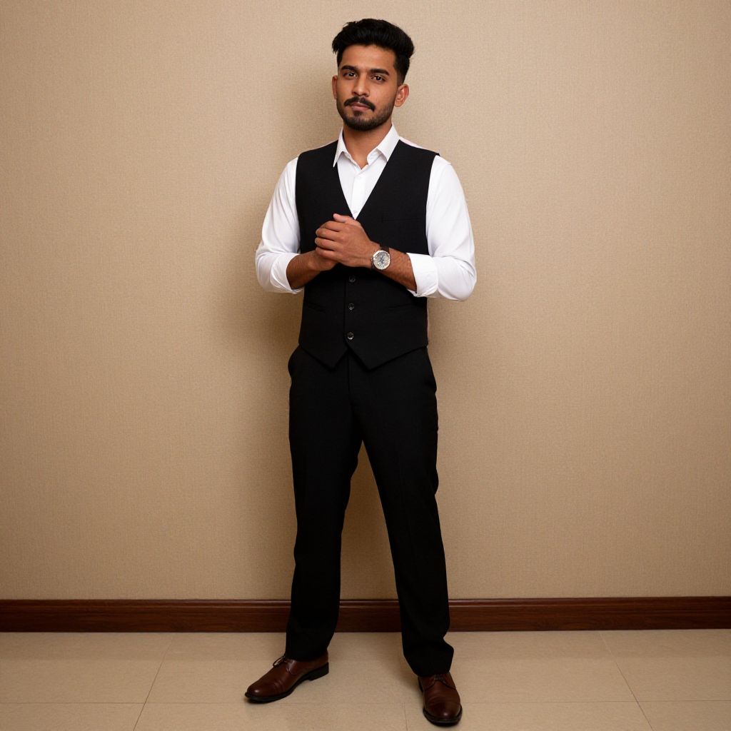 "pesach costume, 1boy, male focus, solo, facial hair, pants, vest, indoors, standing, shirt, brown footwear, mustache, full body, watch, white shirt, own hands together, black hair Realistic photo of casual sexy person with pretty face"