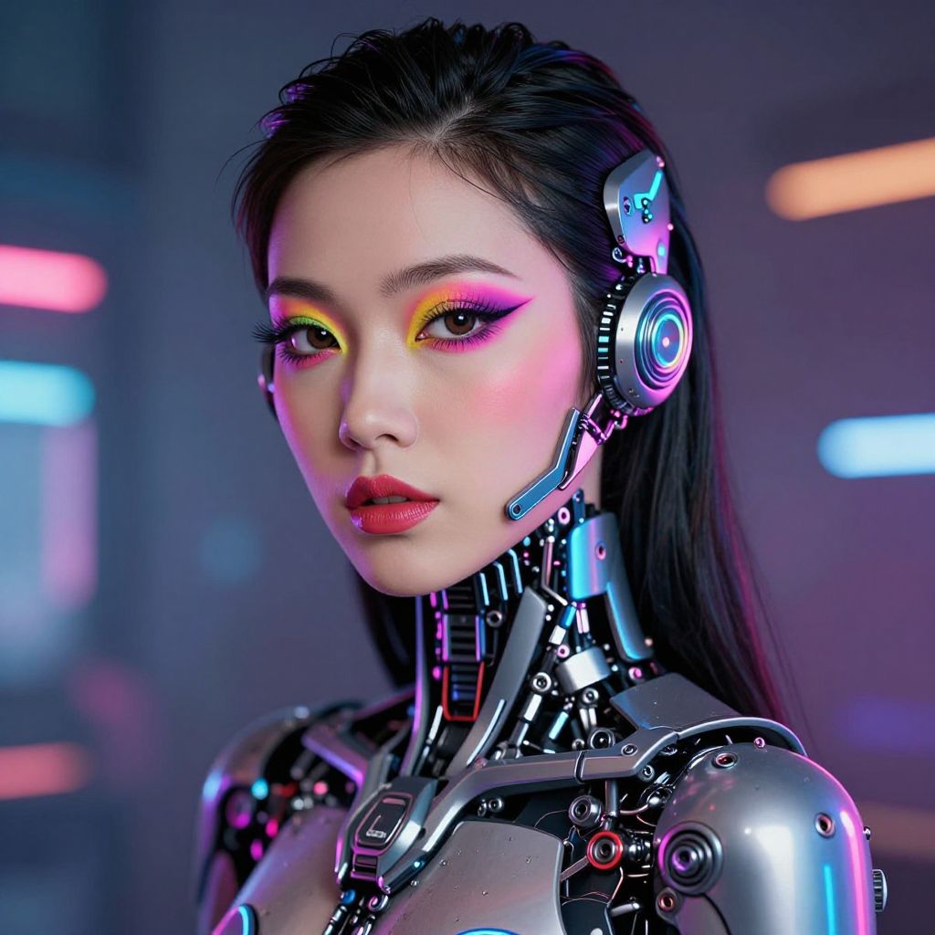 A futuristic, cybernetic woman with vibrant, neon makeup and intricate mechanical components, set against a blurred, colorful background.