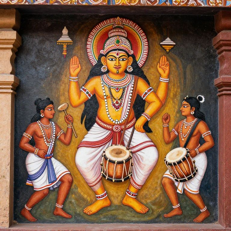 Ayyanar, tribal guardian figure, painted in vivid colors on temple walls, dynamic composition showing folk dancers and drummers celebrating, traditional South Indian motifs, earthy textures, natural daylight, immersive ethnic ambiance