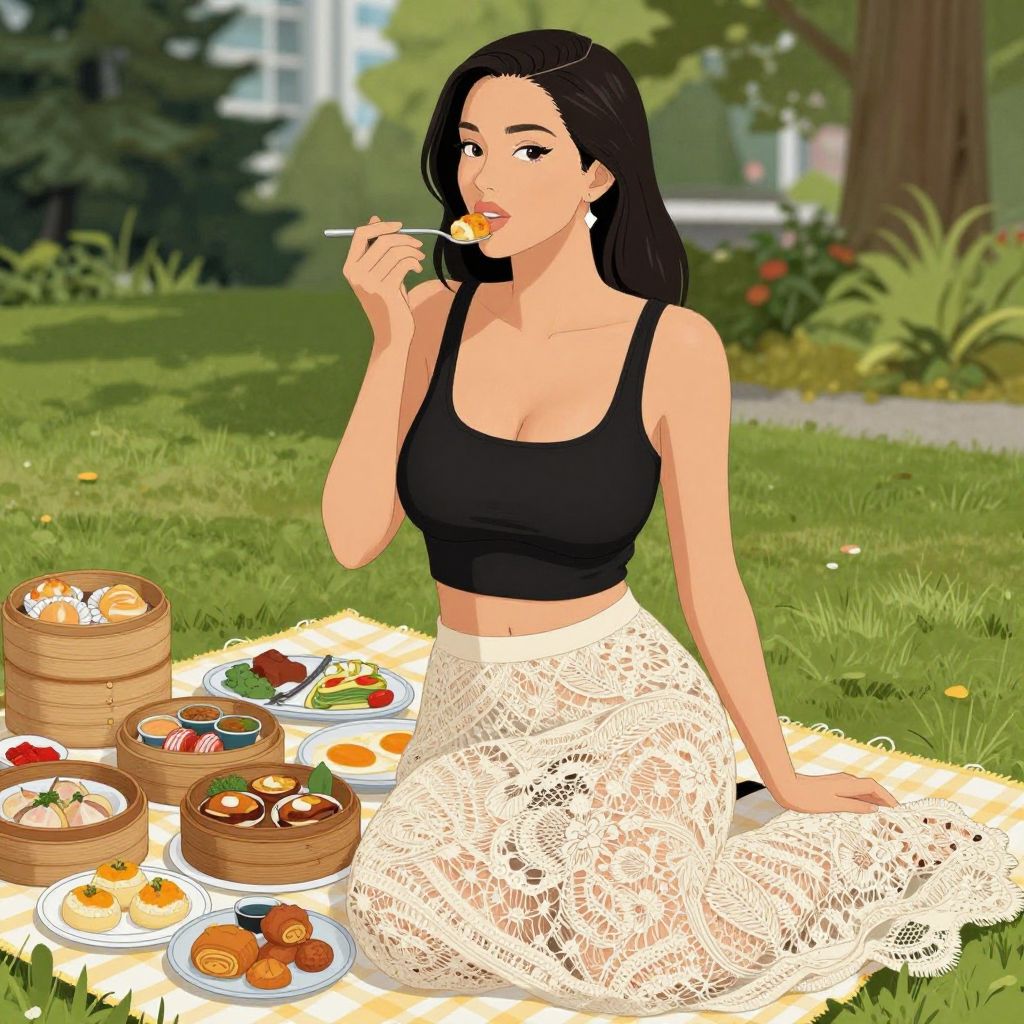 A slim woman in a casual boho style, wearing a cropped black tank top and a cream-colored lace maxi skirt, enjoys a Dim Sum picnic in Vancouver, surrounded by vibrant food and greenery, illustrated in the visual style of Yen Press. Sexy. Pretty face and beutiful eyes Sexy. Pretty face and beаutiful eyes. Big breasts