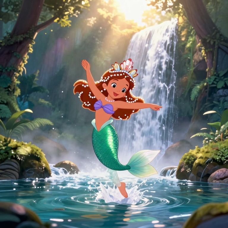 Create an enchanting scene in a nostalgic style reminiscent of classic animated films, featuring a young mermaid with hair that glistens like pearls gracefully dancing atop a cascading waterfall. She wears a detailed seashell crown that sparkles under the sun as she moves to an unheard tune. The lush, vibrant forest emerging from misty mountains creates a sense of wonder and enchantment in the background. As golden sunlight bathes her radiant form, it creates a mesmerizing play of light across the crystal-clear waters below, evoking feelings of magic, adventure, and timeless innocence in this captivating panorama.