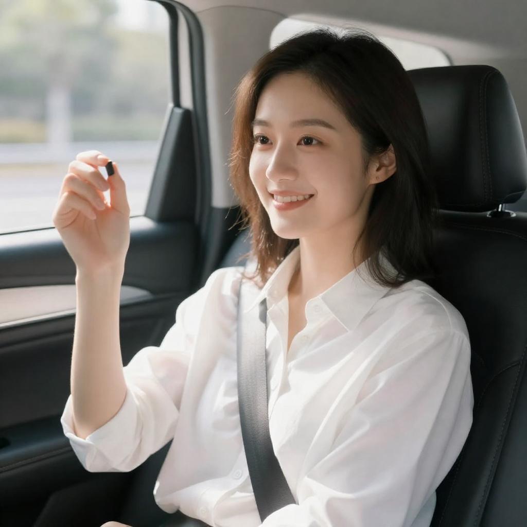 Asian woman with short, wavy dark hair, wearing a purple jacket, driving a car, holding the steering wheel with both hands, looking to the side, blurry industrial background.