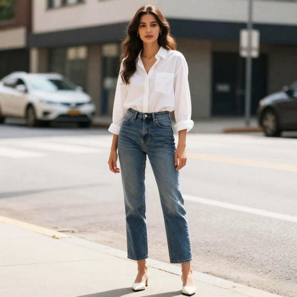Trouser Jeans, woman in a white shirt and jeans standing on a street corner