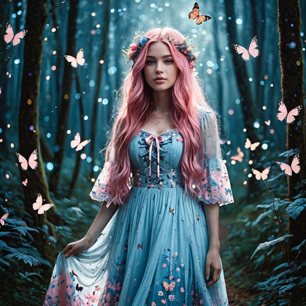 A fantasy portrait of a young woman with long flowing pink hair adorned with a floral crown, wearing a pastel blue dress embellished with pink floral embroidery. She is standing in a mystical forest surrounded by glowing blue and pink butterflies, with an ethereal and dreamy magical ambiance created by soft sparkling lights and blurred forest background.