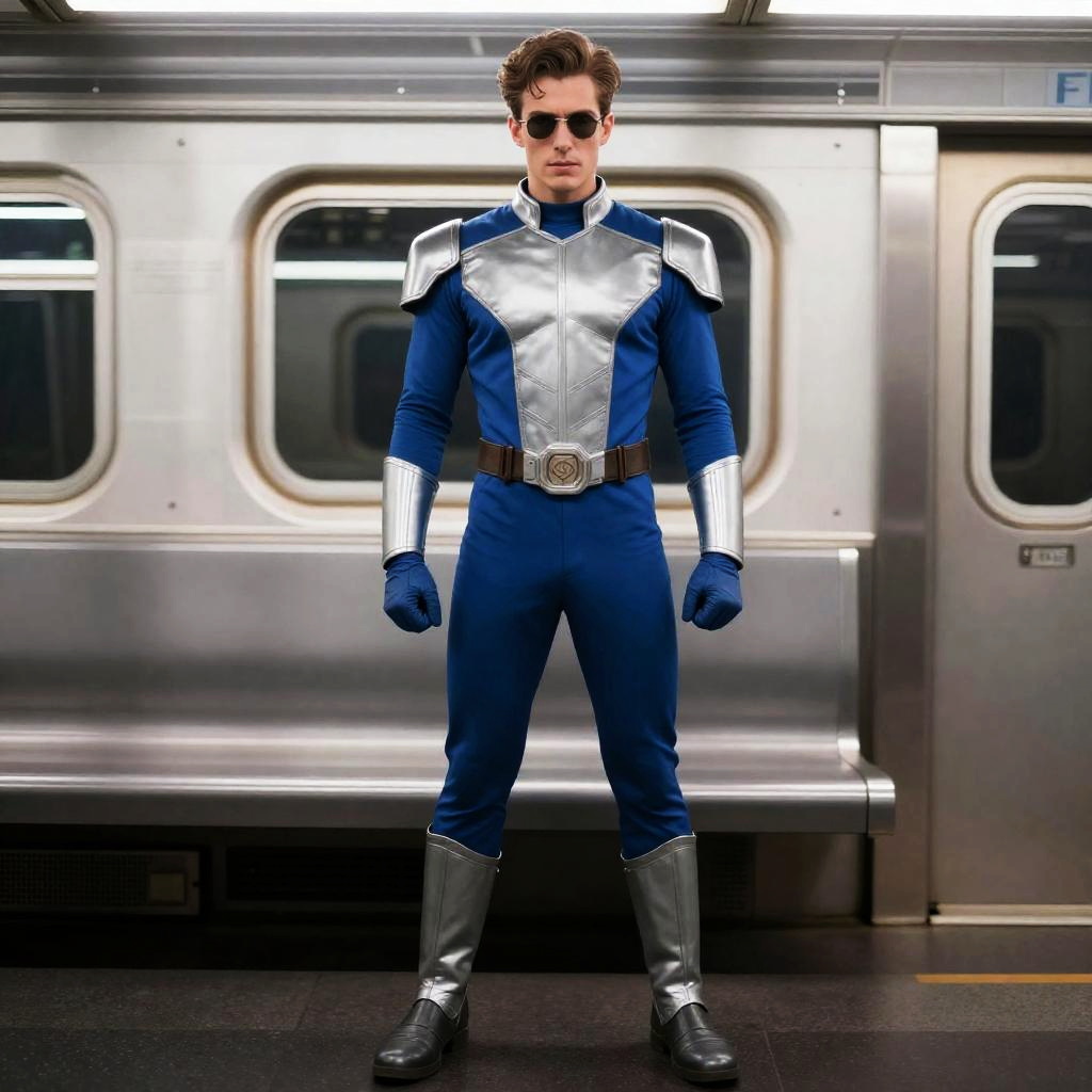Megamind Metro Man, dressed in a blue and silver suit standing in a subway