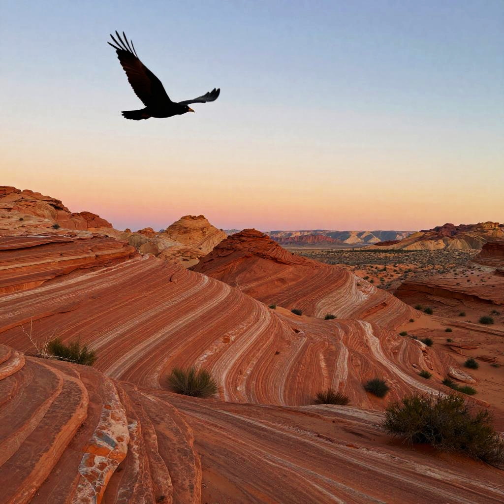 Photograph of a vibrant desert landscape at sunset. The foreground features rugged, reddish-orange rock formations with white streaks, creating a textured, undulating surface. Sparse green shrubs dot the ground. In the upper left, a bird with outstretched wings glides over the scene, its feathers dark against the colorful sky. The sky transitions from orange to blue, adding depth to the image.