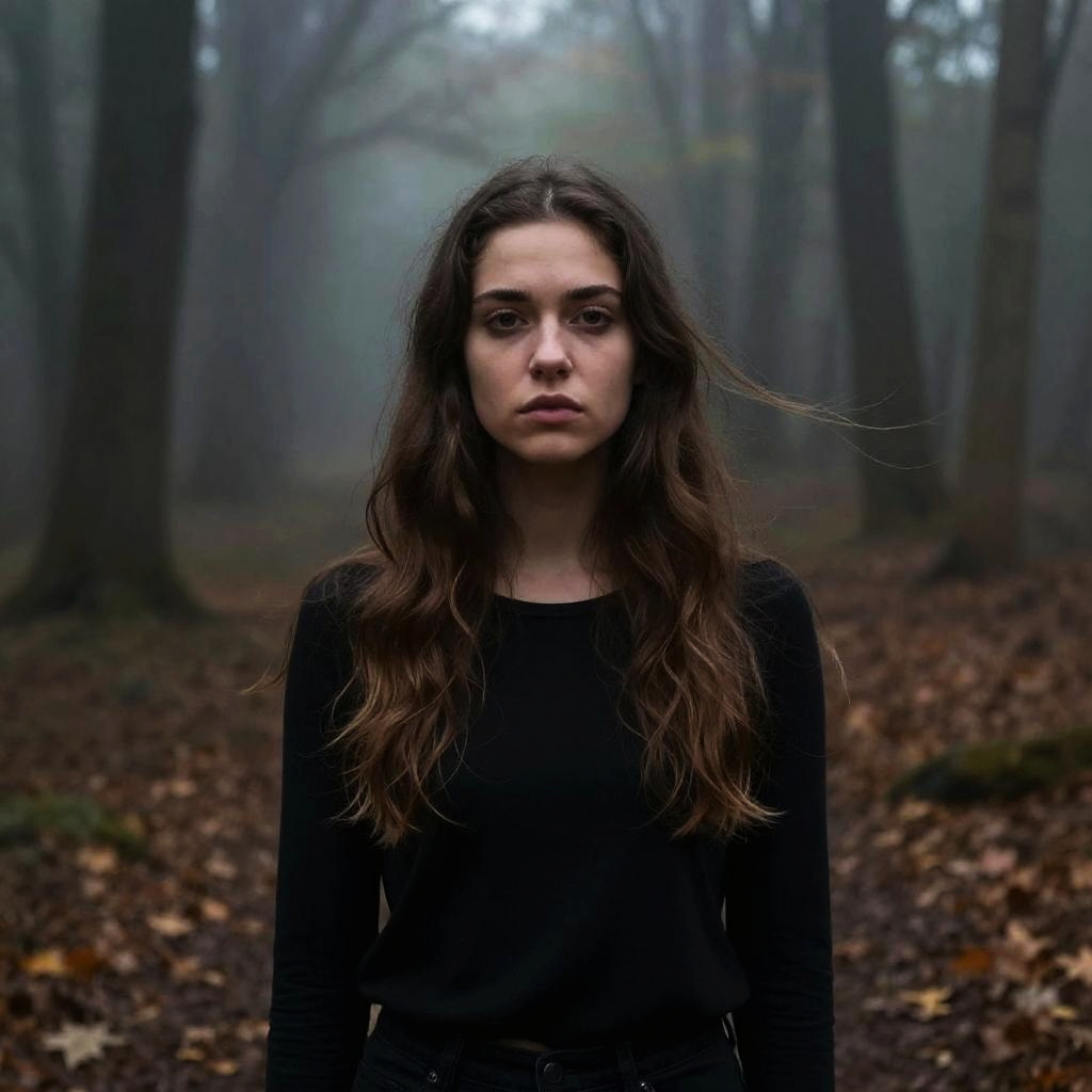 Photograph of a young woman with long, dark brown hair and fair skin, sitting against a dark, green, vine-covered wall. She's wearing a black, fuzzy coat and a mustard-yellow skirt, with her right hand touching her chin thoughtfully. The background is filled with tangled, brown branches, adding a rustic, almost eerie feel to the image. Her expression is serious and slightly pensive.