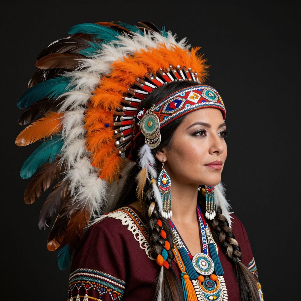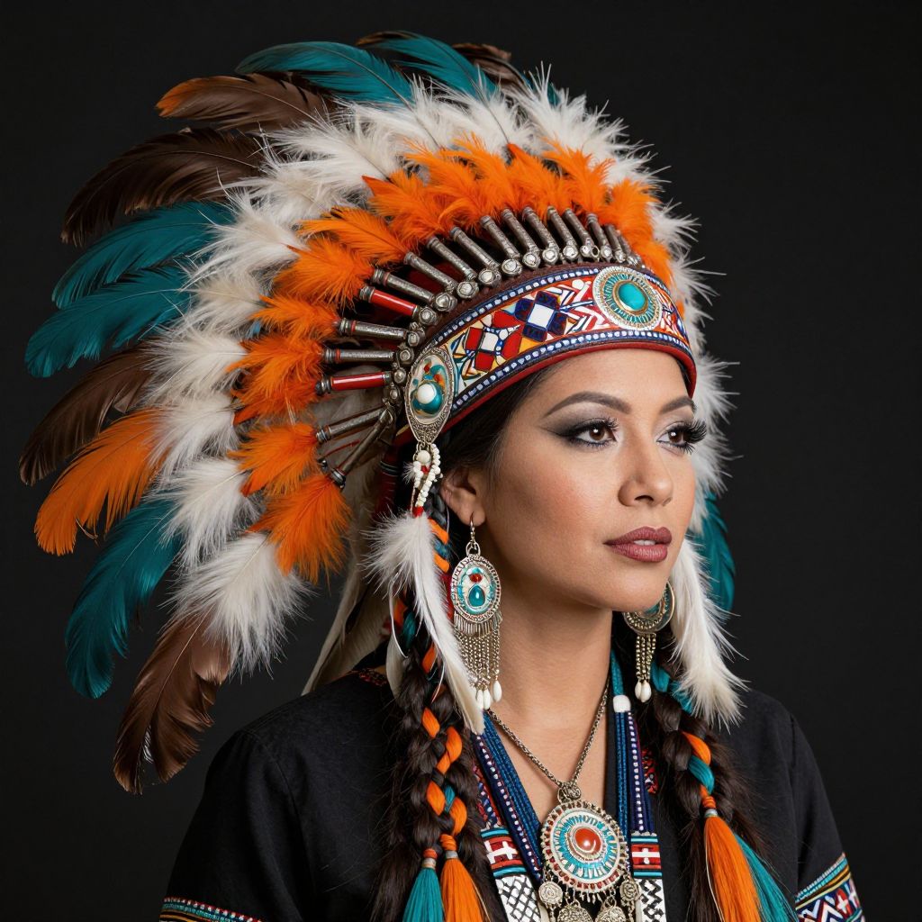 Elegant Native American woman adorned with a vibrant headdress featuring orange, teal, and white feathers, complemented by intricate patterns and traditional jewelry, including braided hair and dangling earrings, set against a dark background.