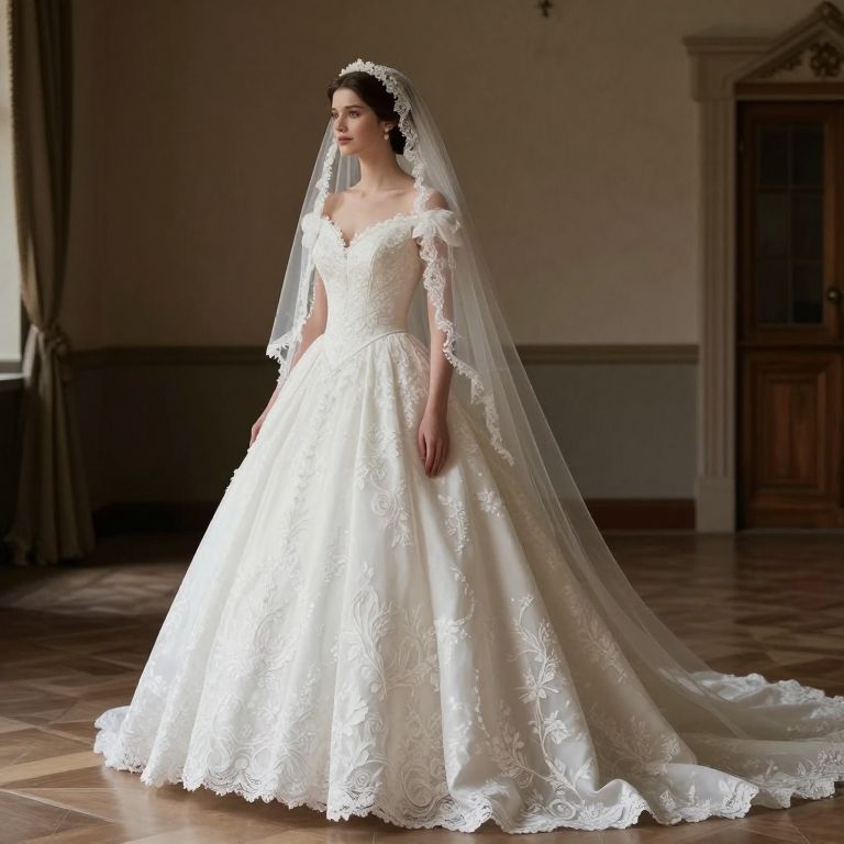 Queen Anne Wedding Dress, bride in a wedding dress standing in a hall with a veil