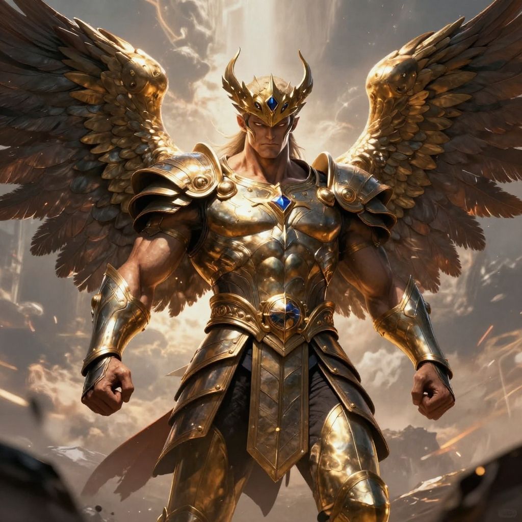 This striking illustration features a powerful figure with majestic wings, embodying strength and determination. The intricate details highlight the character's muscular physique and grand armor, set against a dynamic, dramatic backdrop that enhances the overall intensity of the image.