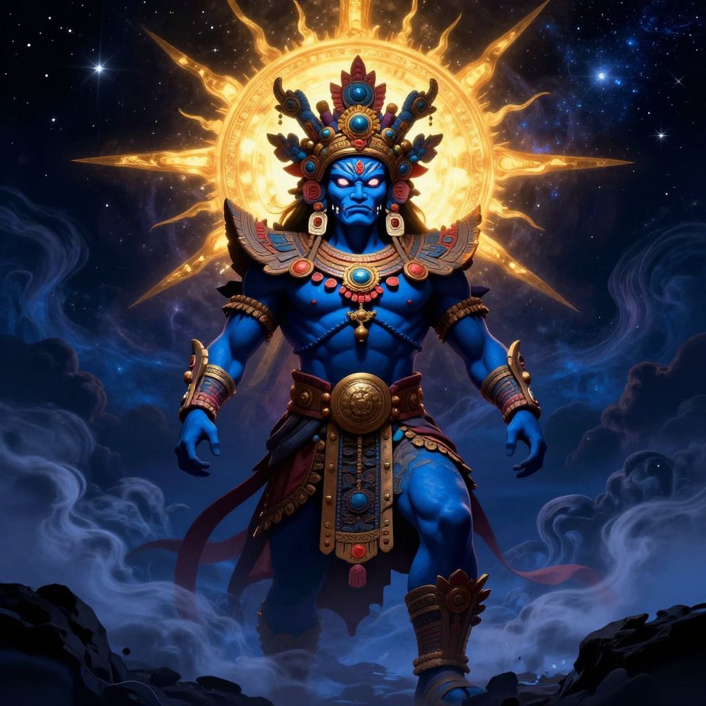 Digital artwork of a muscular, blue-skinned deity with glowing sun halo, adorned with gold and red jewelry, standing on rocky terrain under a starry