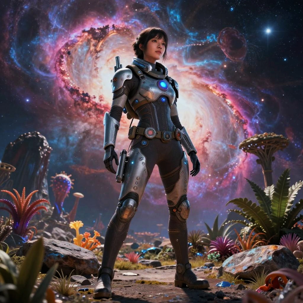 A female futuristic explorer wearing advanced tech gear with glowing elements stands confidently on a rocky alien landscape. The background features a vibrant nebula and surreal strange flora under cinematic lighting, creating a highly detailed sci-fi ambiance. The woman has short dark hair and wears a sleek armored suit, embodying a dynamic pose in this vivid and otherworldly environment.