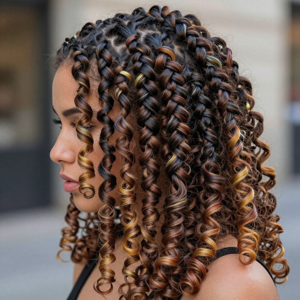 Drill hair style, close-up portrait of a woman with intricate twisted drill curls cascading down, vibrant colors, detailed textures, soft lighting, urban background, high resolution, realistic yet artistic hair styling, fashion-forward vibe.