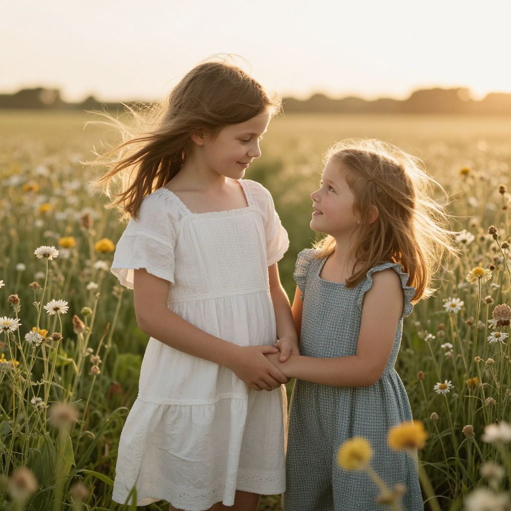 Photograph of two young girls standing in a sunlit meadow filled with wildflowers. The girl on the left has light brown hair in a loose ponytail, wearing a white, short-sleeved, embroidered dress. The girl on the right has blonde hair, wearing a blue gingham dress. They are holding hands and smiling at each other, with sunlight casting a warm glow on their faces and hair. The background features a blurred, golden field at sunset. The image exudes a sense of innocence and joy.