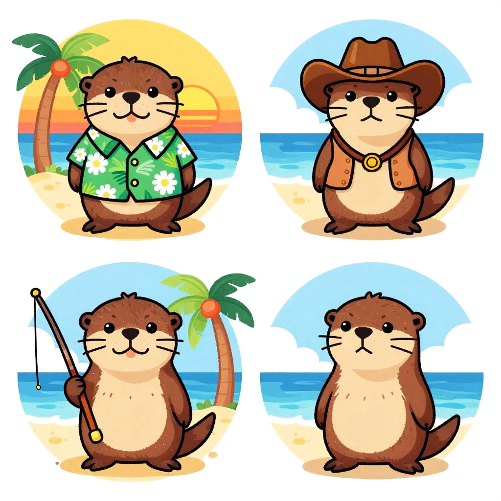 Cartoon otter illustrations: top left in green Hawaiian shirt, sunset; top right in brown cowboy hat, orange shirt; bottom left fishing, palm