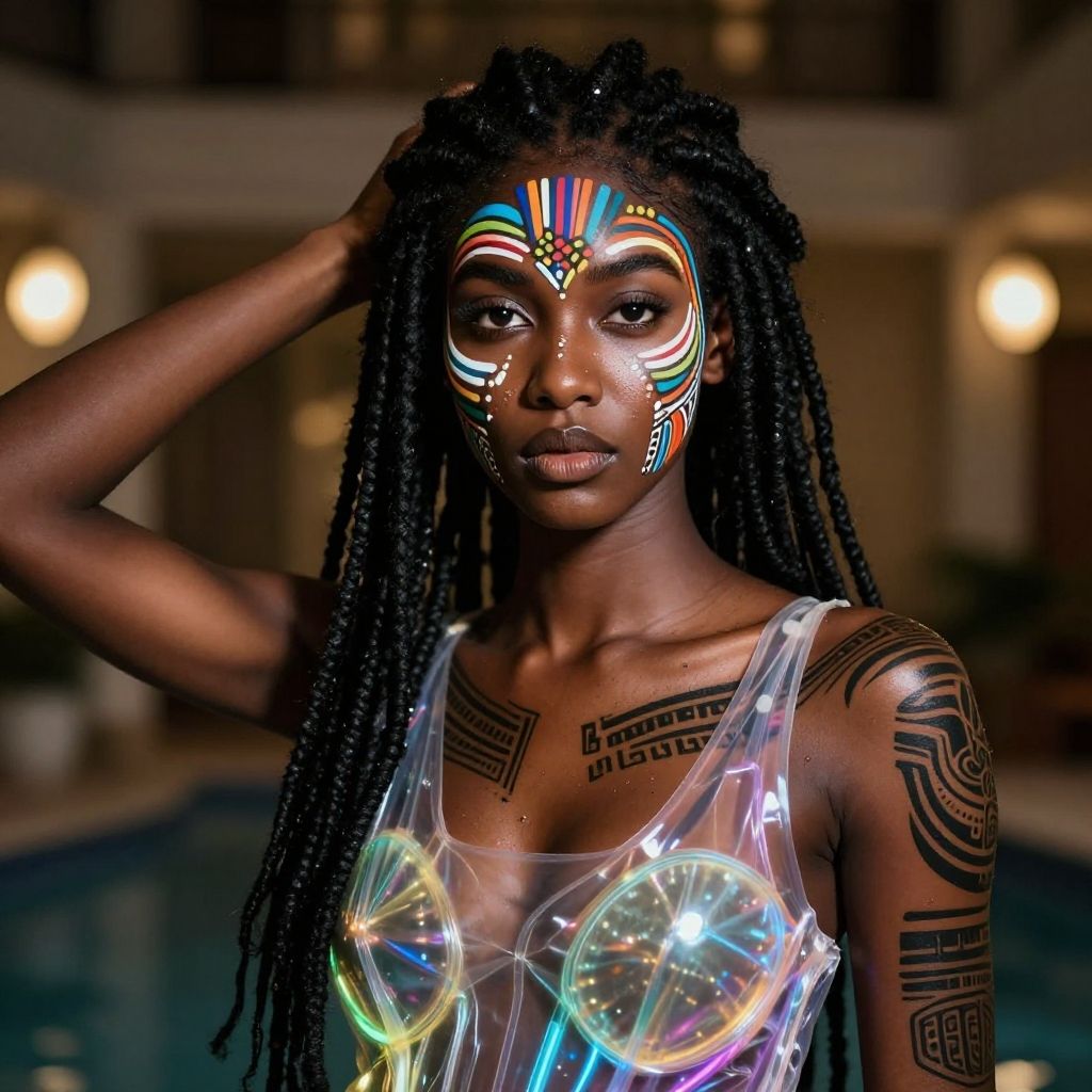 Photograph of a dark-skinned woman with long, intricately braided hair standing in a dimly lit indoor pool area. She wears a transparent, iridescent top revealing her medium-sized, natural breasts. Her face is adorned with vibrant, geometric tribal paint in colorful patterns. Her arms feature black tribal tattoos. She has one hand raised, touching her hair. The background is blurred, with warm, soft lighting from wall sconces and a pool visible. The image has a high-contrast, almost surreal quality, emphasizing her striking appearance and the shimmering texture of her top.